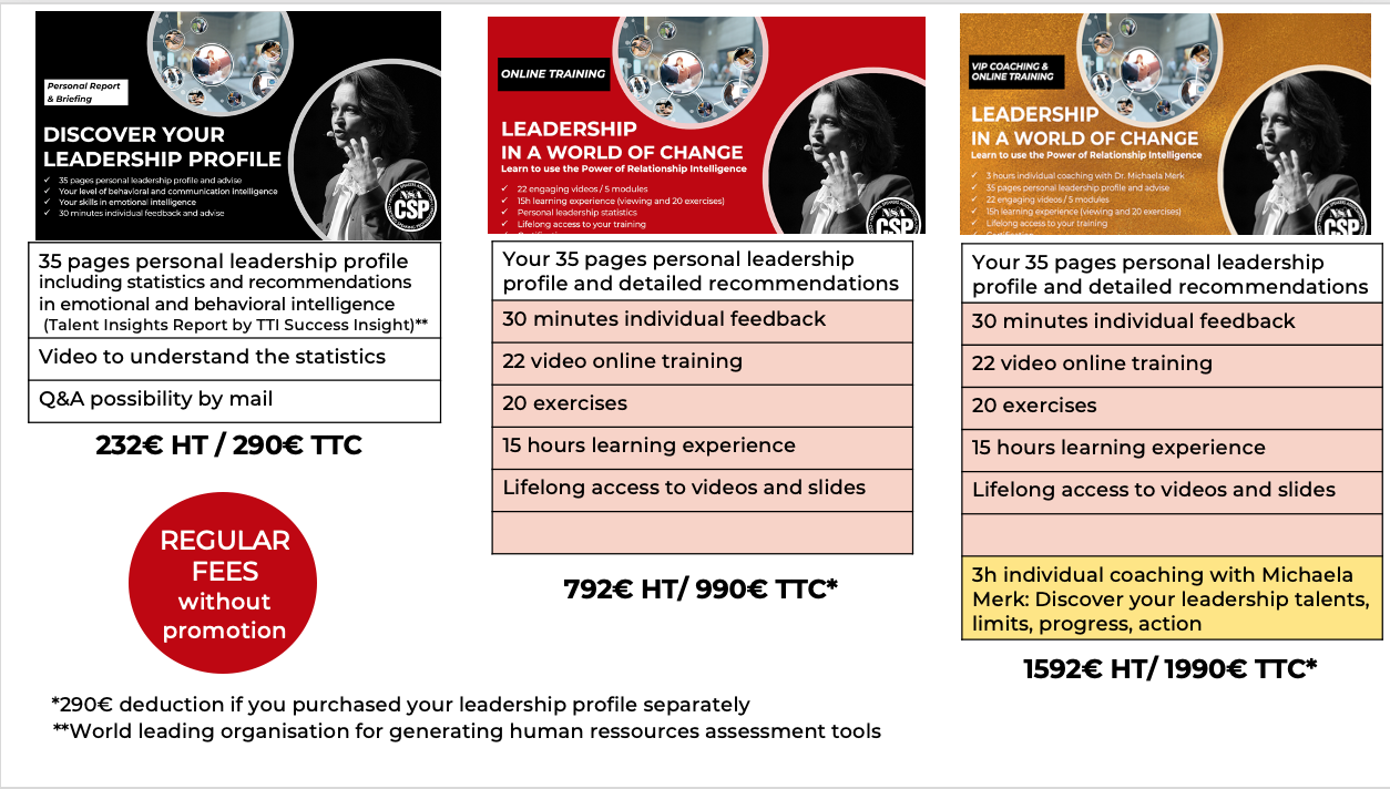 Obtain 3h individual leadership coaching / 22 training videos/ 20 exercises / 35 pages personal leadership profile / 15h online training experience / Lifetime access to videos