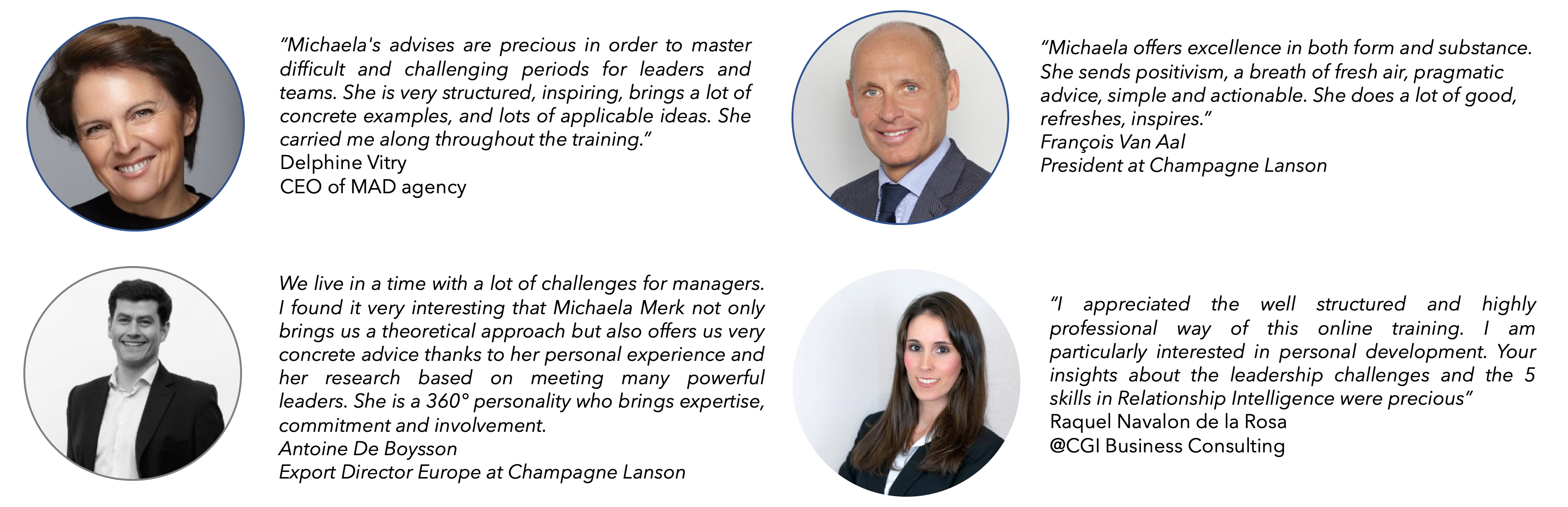 L’Oréal, Dior, Hermès, Four Seasons Hotels, Rolex, Shiseido, Vacheron Constantin and many more. During her own leadership experience in international companies Michaela experienced what it means to lead through times of transformation. She also realized that relationship and emotional intelligence contributed to 80% of leadership success while hard skills (such as finance, strategy or sales related skills) were not what held the ship together;